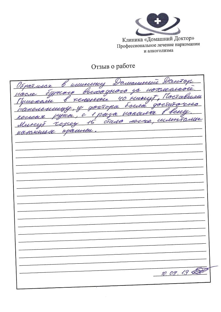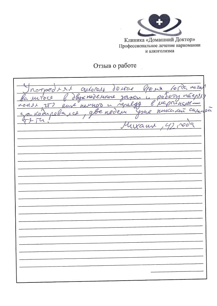 Я выбрал кодирование на 3 года, и это решение оказалось правильным. Алкоголь больше не контролирует мою жизнь, и я чувствую себя значительно лучше. Благодарю за шанс вернуться к нормальной жизни.